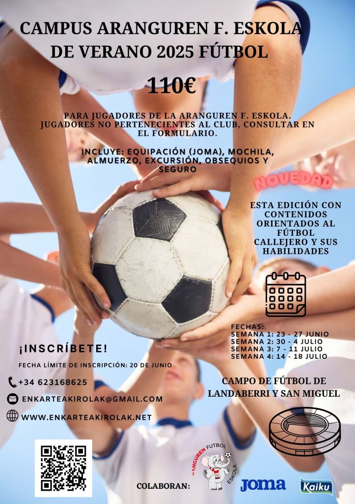 para los jugadores pertenecientes a la estructura de la Aranguren Futbol Eskola. Con relación a niñ@s que no pertenezcan a dicho club, el precio será de 10€ más por cada semana.